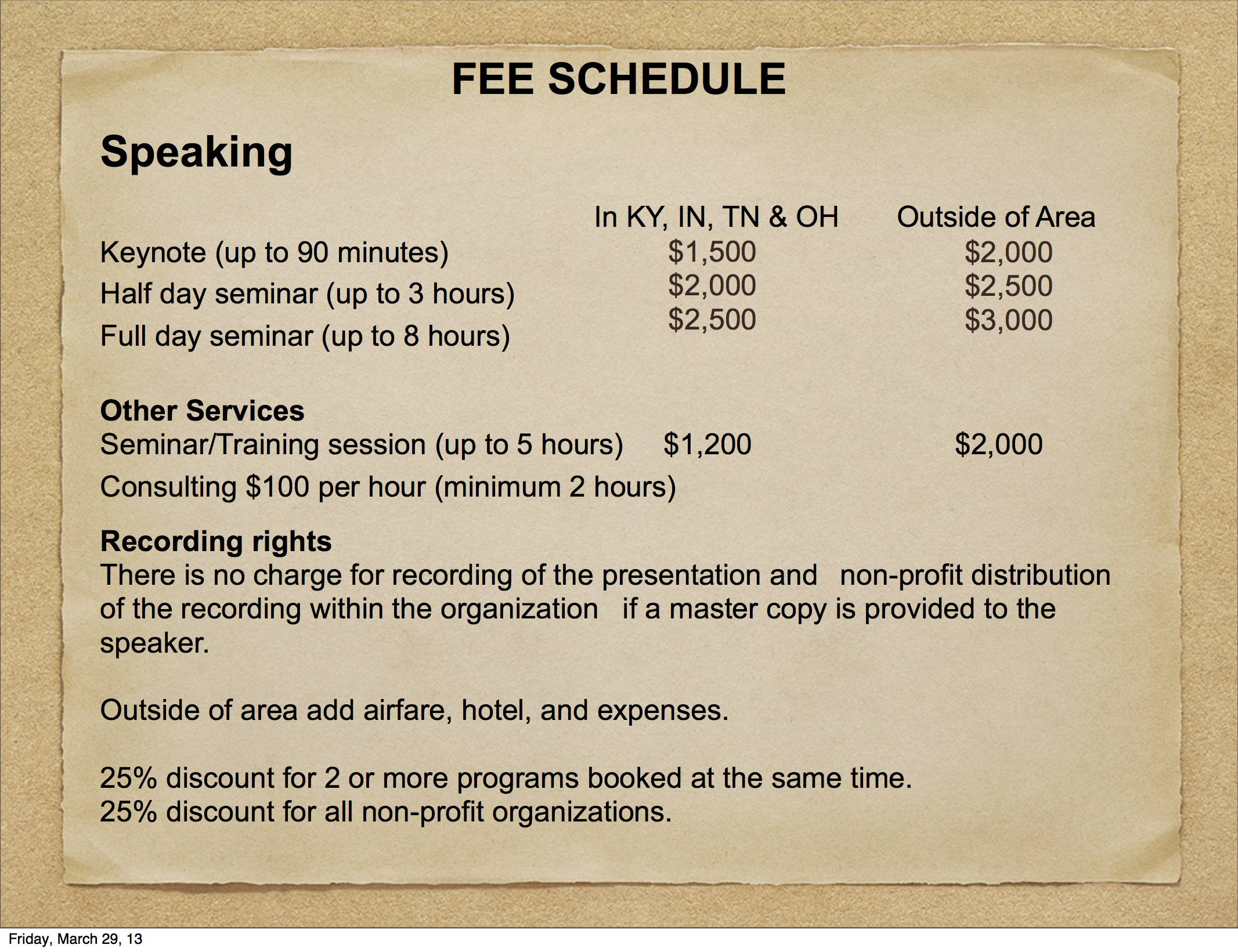 Speaking Fee Schedule Share this: Click to share on X (Opens in new window) X Click to share on Facebook (Opens in new window) Facebook Like Loading...